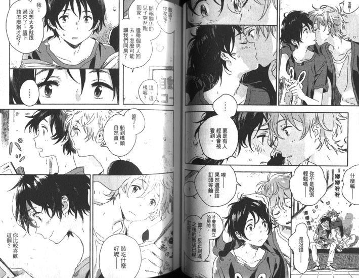 ……嗯,就是這樣。如果說《海邊》是一對同性情侶相識相戀的愛情故事,《春風》就是描述一個家庭接受這對同性情侶的過程。以BL漫畫來說,主題算是比較特別的;甚至後來的劇情走向,也有點不太像BL漫畫了。